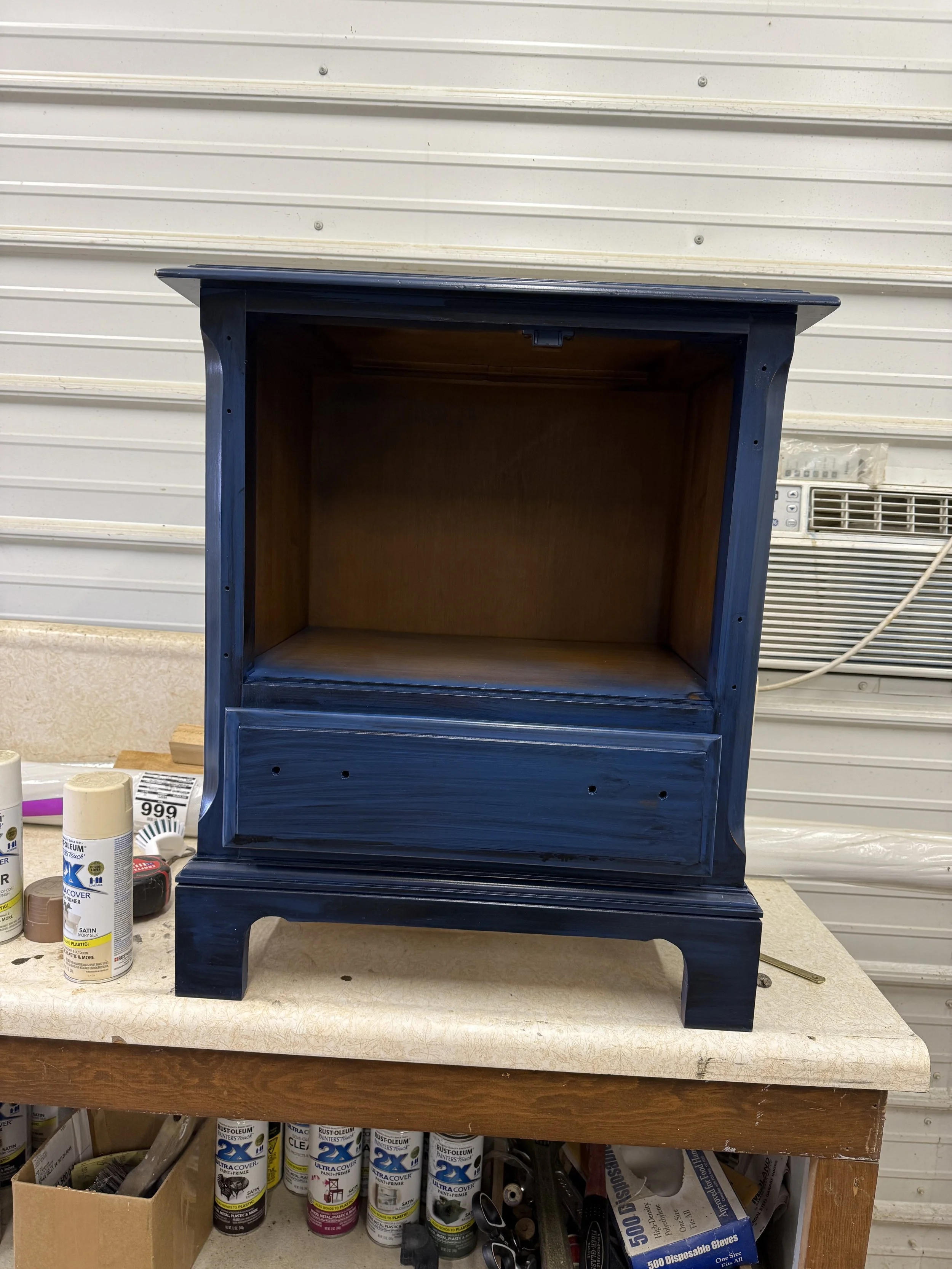 First- This cute end table I am re-working I’m so excited to show before and after but I’ve had to start over on the doors twice now with icky flaws I’m just not ok with. But check out how cute it is looking!