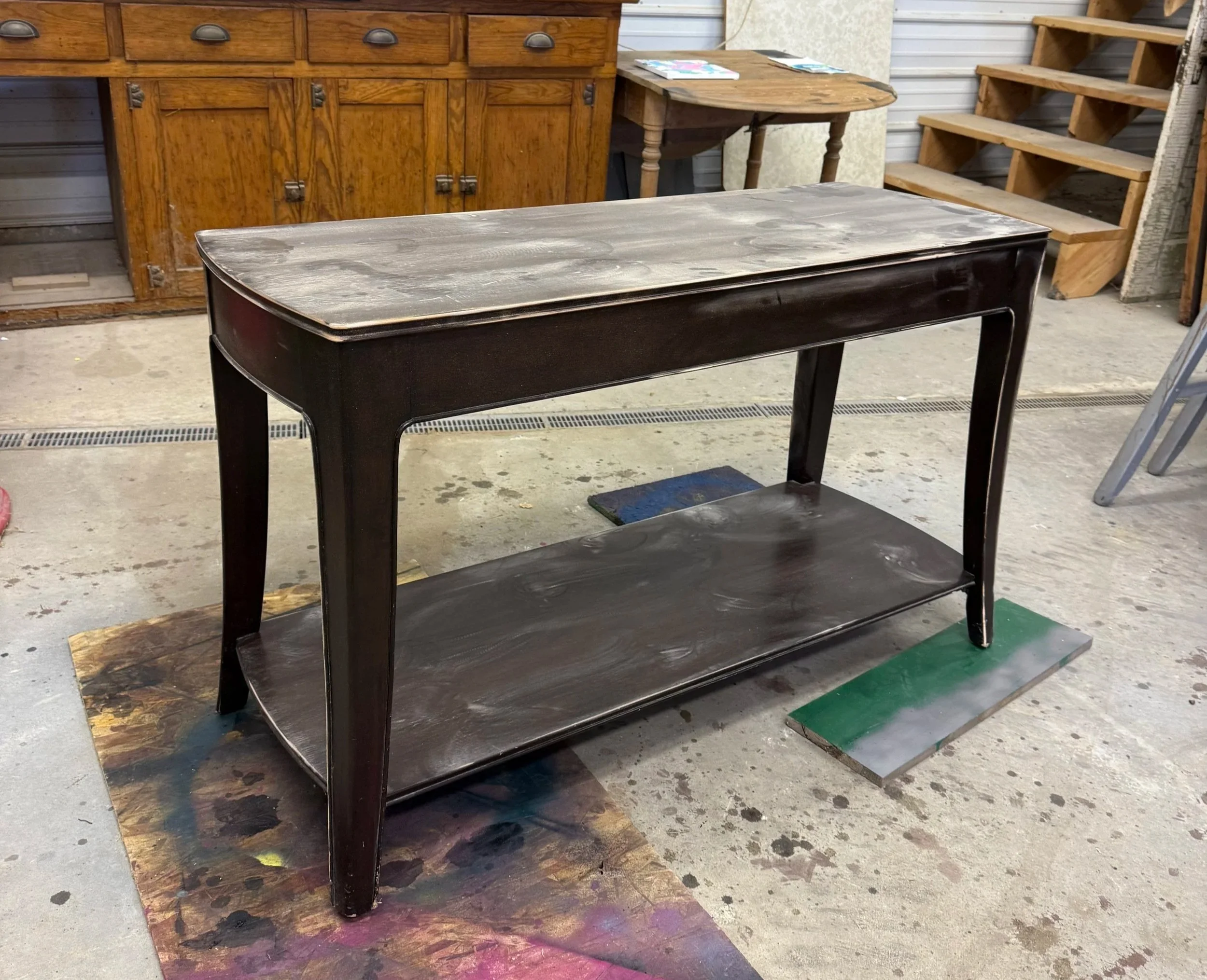 In the summer of 2022, I moved my window treatment business to my showroom, and I have always wanted a console table for my entry way. Someplace for a seasonal floral display and a ‘mailbox’ for customer drop off/pick up. I’m not one to spend a lot of time shopping and searching for something that might not exist with almost no budget for. Hobby Lobby and Home Goods seem to be my favorite places to shop but being outside I was looking at outdoor tables for durability. But they would be ready for planting or drinking or tons of nooks and crannies to collect dust. At $100-200 I just don’t want another complicated thing to clean!
